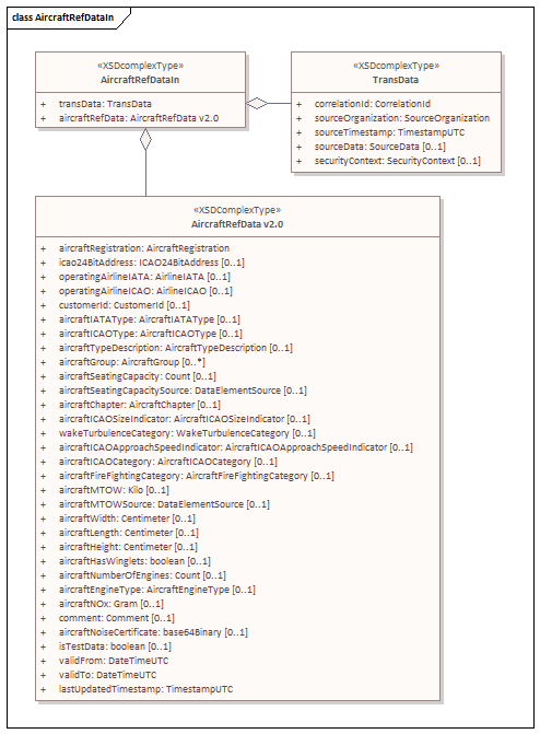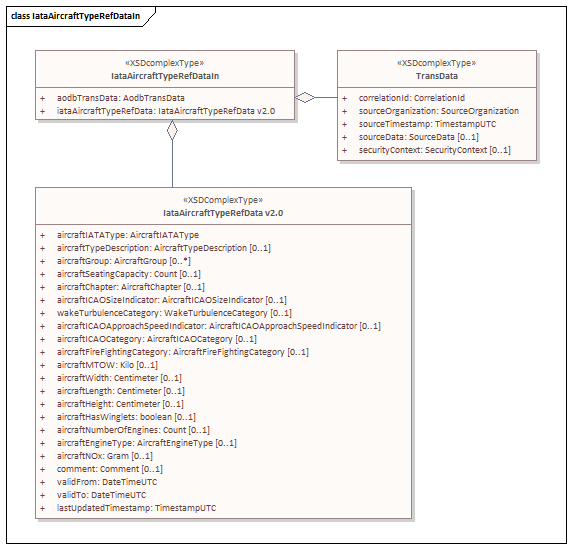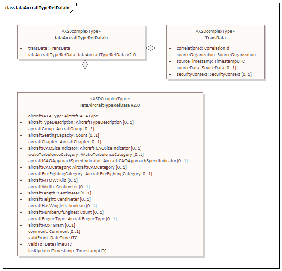 Element Comments AircraftIATAType AircraftTypeDescription AircraftGroup AircraftSeatingCapacity AircraftChapter AircraftICAOSizeIndicator WakeTurbulenceCategory AircraftICAOApproachSpeedIndicator AircraftICAOCategory AircraftFireFightingCategory AircraftWidth AircraftLength AircraftHeight AircraftHasWinglets AircraftNumberOfEngines AircraftEngineType AircraftNOx Comment ValidFrom ValidTo LastUpdatedTimestamp