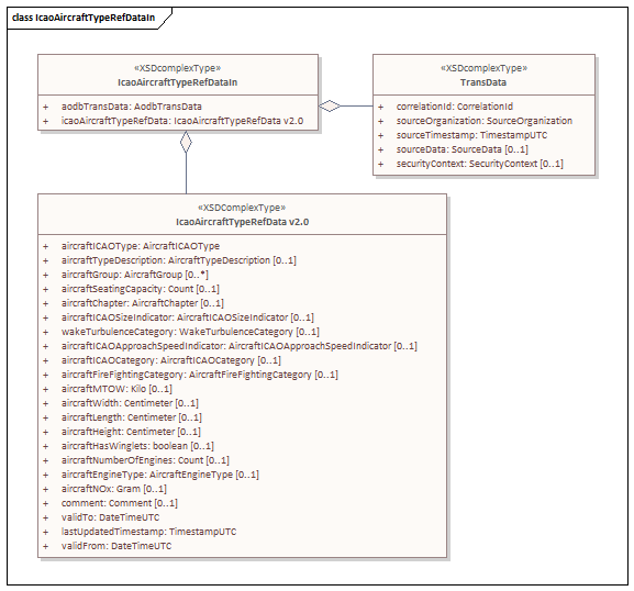 Element Comments AircraftICAOType AircraftTypeDescription AircraftGroup AircraftSeatingCapacity AircraftChapter AircraftICAOSizeIndicator WakeTurbulenceCategory AircraftICAOApproachSpeedIndicator AircraftICAOCategory AircraftFireFightingCategory AircraftWidth AircraftLength AircraftHeight AircraftHasWinglets AircraftNumberOfEngines AircraftEngineType AircraftNOx Comment ValidFrom ValidTo LastUpdatedTimestamp